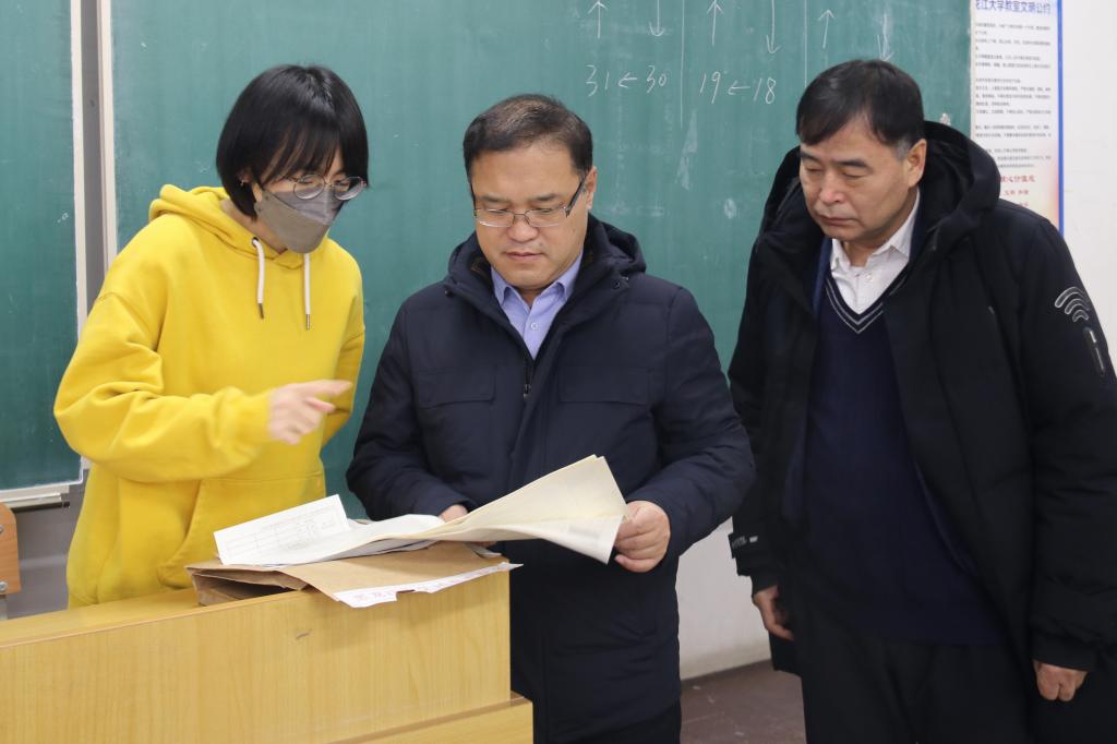 井立强一行走进考场,检查监考人员的监考工作情况、试卷命题情况和考生答题状况,询问监考教师课程考核的成绩占比,以往的通过率等情况。井立强与相应课程主考教师针对本学期教学开展情况和通过考试命题考核学生分析问题、解决问题能力等方面进行了交流。