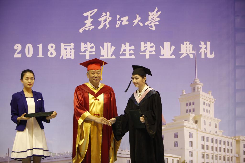 2018届国际文化教育学院毕业生、来自乌克兰的林妮娜代表留学生毕业生发言。她回顾了五年的大学生活,感谢黑大留给她的知识、经验和友谊,并深情表示,无论未来走到哪里,都会记住这里难忘的回忆、珍惜在黑大的美好回忆。