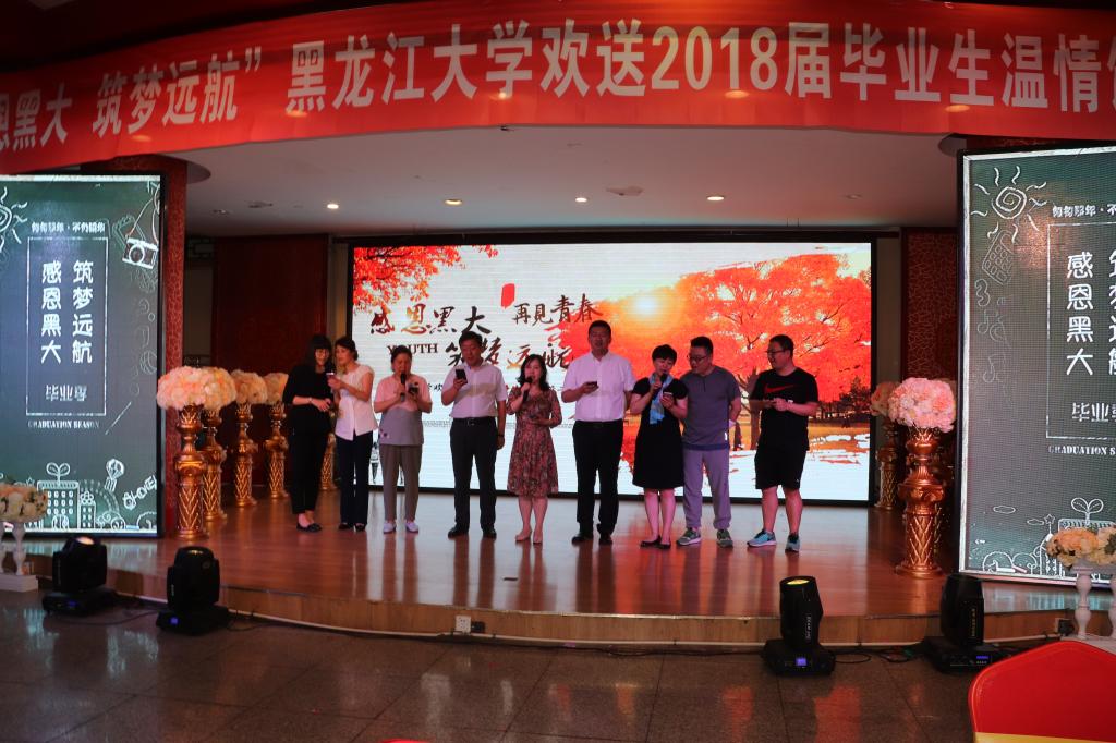 席间,老师和同学们带来了精彩纷呈的表演节目,用歌声与欢笑留住在黑大的最后一个瞬间。18届文学院毕业生王刚带来一首《千里之外》,离别的伤愁顿时弥漫;新闻传播学院院长、书记、辅导员以及学生代表共同上台表演诗朗诵,表达在大学四年内对母校的深切情感;校团委、党委学工部老师共同演唱《相逢是首歌》,祝愿所有毕业生一路平安,前程似锦;教育科学学院的毕业生代表上台演唱《老男孩》,为毕业笼上一层淡淡愁绪;研究生毕业生、生命科学学院辅导员李传英老师为大家带来一首《珍惜》,感恩黑大在生命中留下的印迹,珍惜此刻的美好时光,祝愿明天新的征程……大家通过诗朗诵、唱歌、舞蹈等多种形式表达对离别的不舍深情,对母校师长的感恩感激,对未来可期的美好祝愿。学校希望始终铭记"博学慎思,参天尽物"的黑大校训,始终秉承"志存高远,爱国奉献,艰苦奋斗,自强不息"的黑大精神,以"宝剑锋从磨砺出,梅花香自苦寒来"的勤勉,以"海阔任鱼跃,天高任鸟飞"的姿态,迈向新的征程。