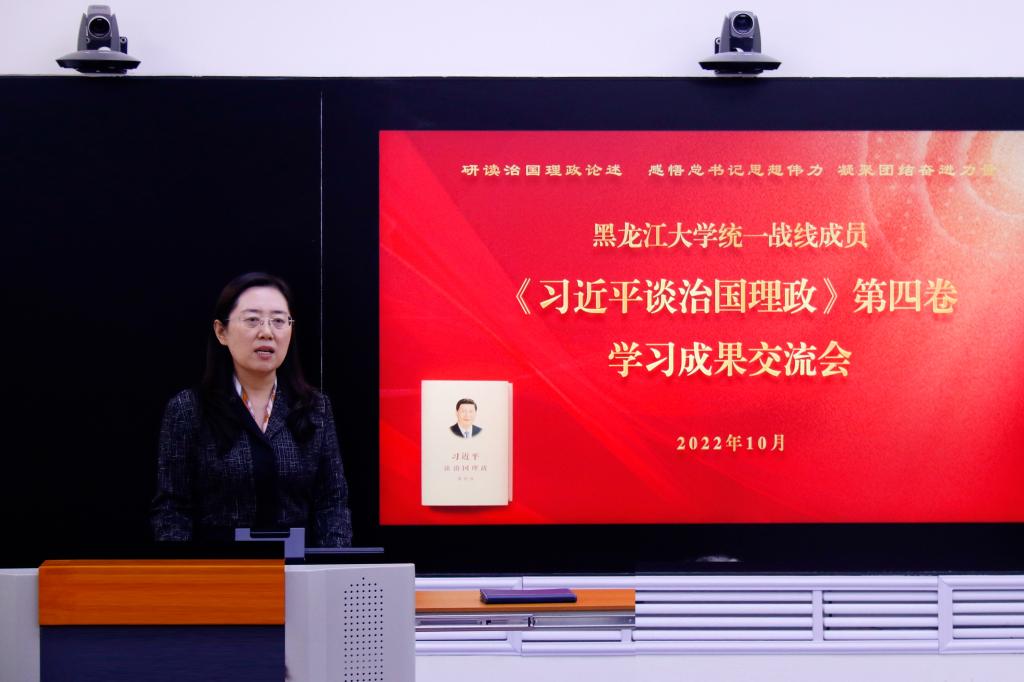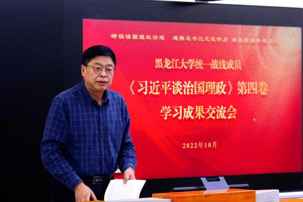 民进黑大支部主委郭孟秀以《深化历史文化自知 增强文化自觉与文化自信》为题进行分享交流。郭教授通过龙江文明发展历史脉络的梳理,阐述了建设中国特色社会主义文化强国,需要通过文化自知-文化自信-文化自强的必要路径,并结合专业研究与学校实际,表达了发挥专业优势,助力中国特色哲学社会科学学科体系、学术体系、话语体系建设的决心。