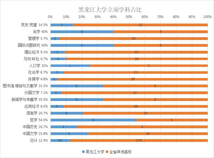 第二,从学院分布来看,立项项目分布在19个文科学院,占所有文科学院的90%。其中经济与工商管理学院7项,马克思主义学院7项,法学院6项,文学院5项,信息管理学院4项,俄语学院3项,俄罗斯语言文学与文化研究中心3项,应用外语学院3项,教育科学研究院2项,历史文化旅游学院2项,新闻传播学院2项,创业教育学院、国际文化教育学院、西语学院、哲学学院、政府管理学院、中俄学院、组织部、体育教研部、黑龙江教育杂志社各1项。