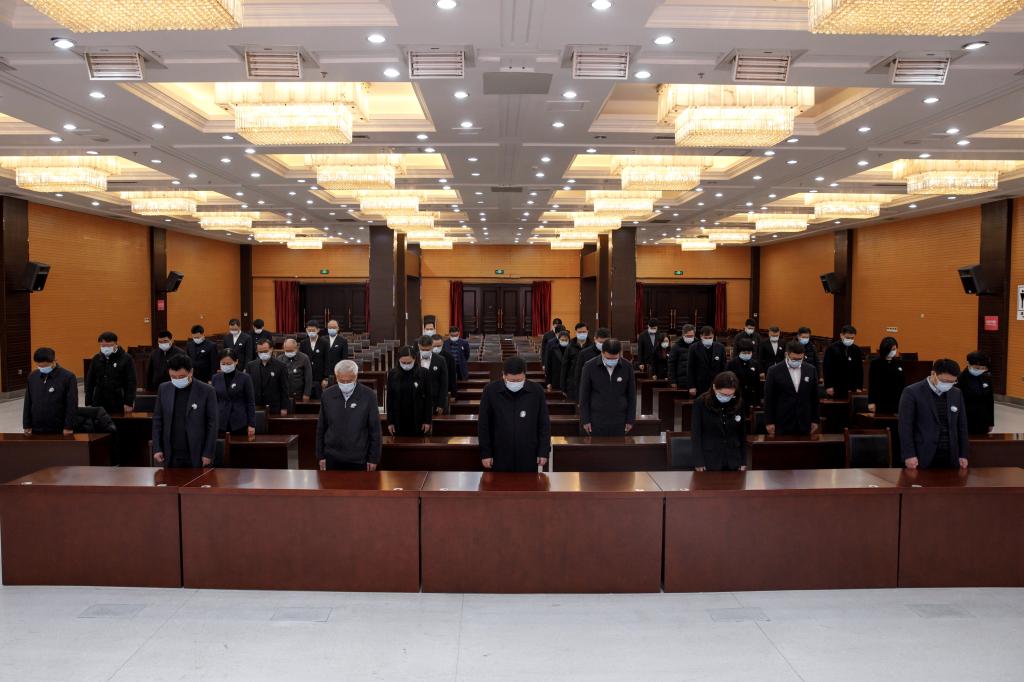 beat365中国官网主楼一楼报告厅庄严肃穆,学校领导、处级干部胸带白花,全体肃立。在低回的哀乐声中,全体默哀3分钟。
