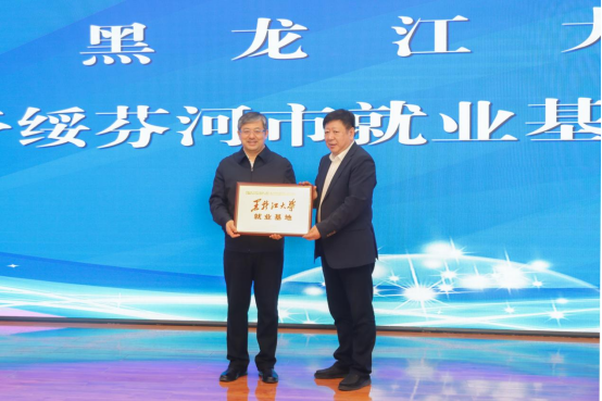 招生就业指导中心主任陈宝凤与绥芬河市委常委、副市长刘庆帅共同签订了《共建人才工作站协议书》和《人才基地建设合作协议》。
