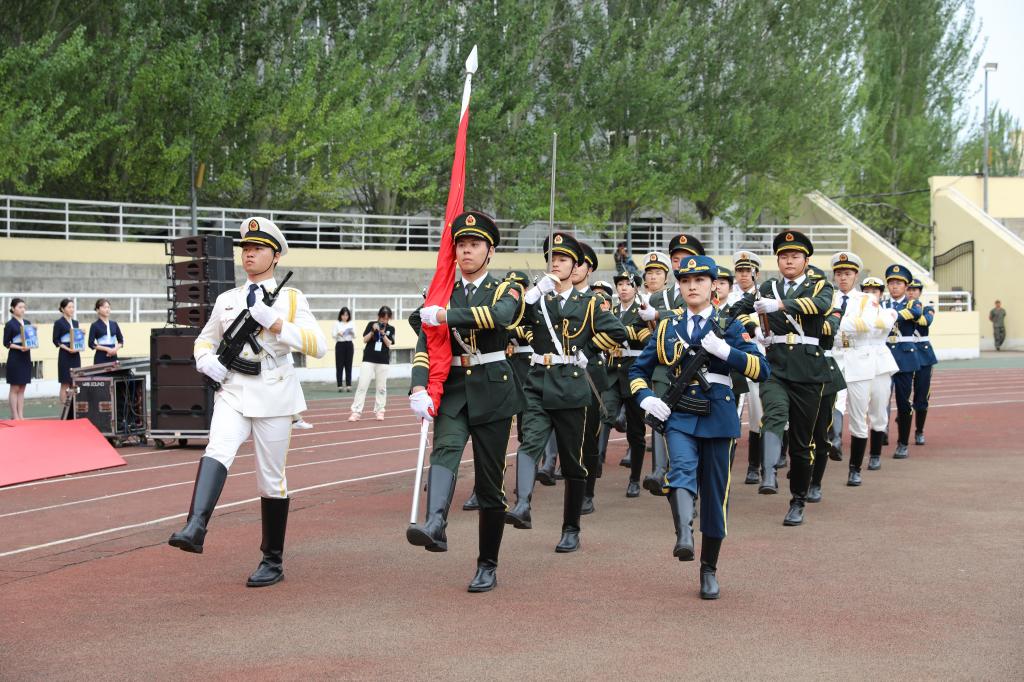 在师生的热切注目下,国旗护卫队精神抖擞,踏着铿锵有力的步伐护送国旗进场。