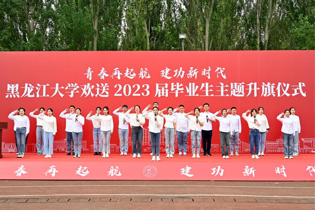 毕业生代表在国旗下肃立,举起右拳,庄严宣誓,表达了黑大青年为实现中华民族伟大复兴贡献青春力量的决心。