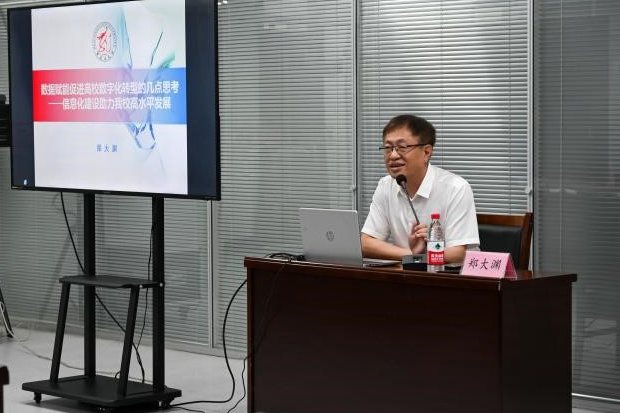 随后,beat365智慧校园建设专家组组长郑大渊做了题为《数据赋能促进高校数字化转型的几点思考——信息化建设助力beat365高水平发展》的专题宣讲。郑大渊分别从数字转型是高校高质量发展的必由之路,高校信息化建设发展回顾,构建beat365中国官网智慧校园体系和高校数字化转型的机遇与挑战四方面为我们提供了专业指导和实践经验分享,使我们了解了智慧校园建设的最新趋势和挑战,思考解决方案,并为下一步推动智慧校园建设明确了思路。